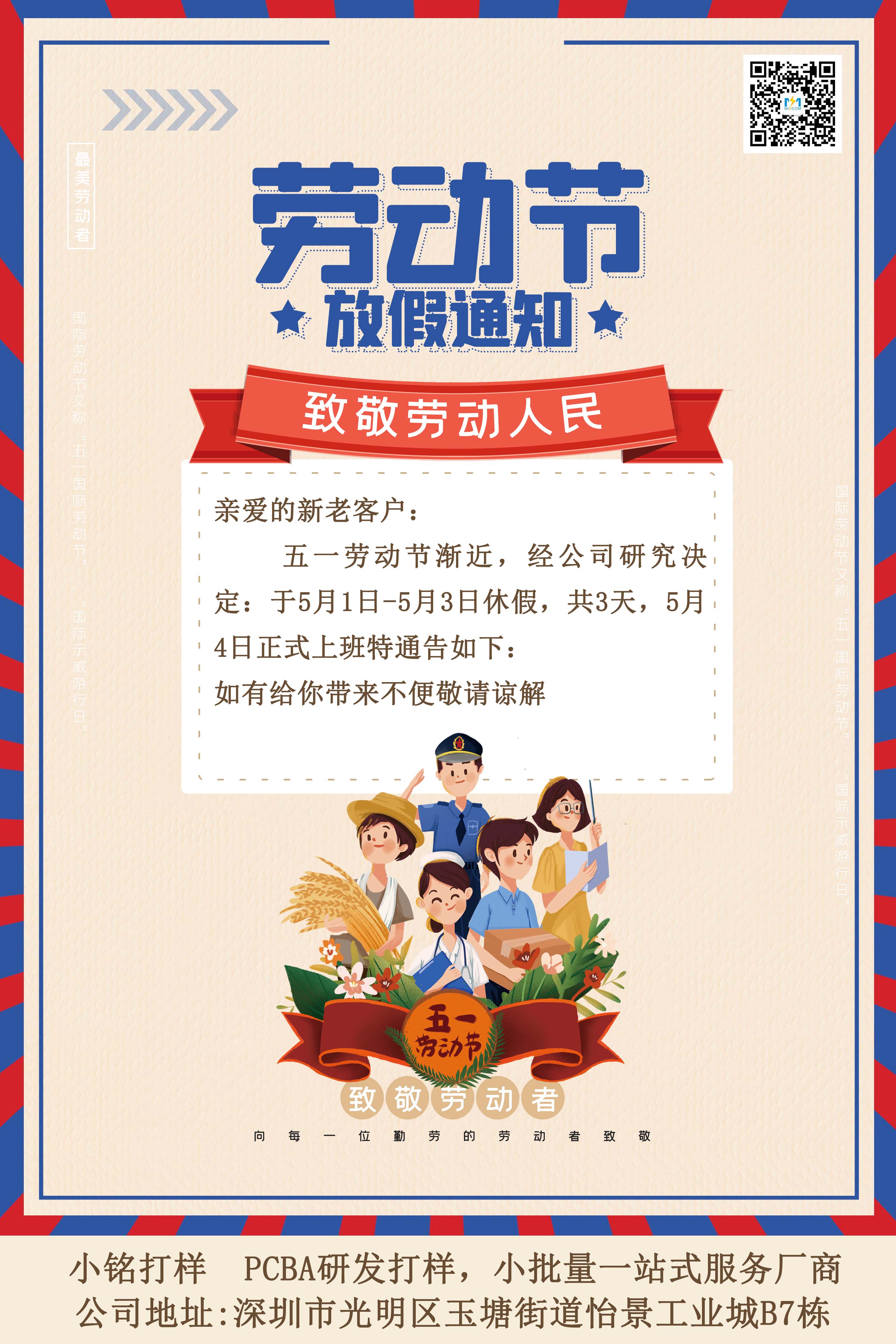 小銘打樣PCBA 五一放假通知,親愛的新老客戶: 五一勞動節(jié)漸近,經(jīng)公司研究決定:于5月1日-5月3日休假,共3天,5月4日正式上班; 特此通告: 如有不便 敬請諒解!